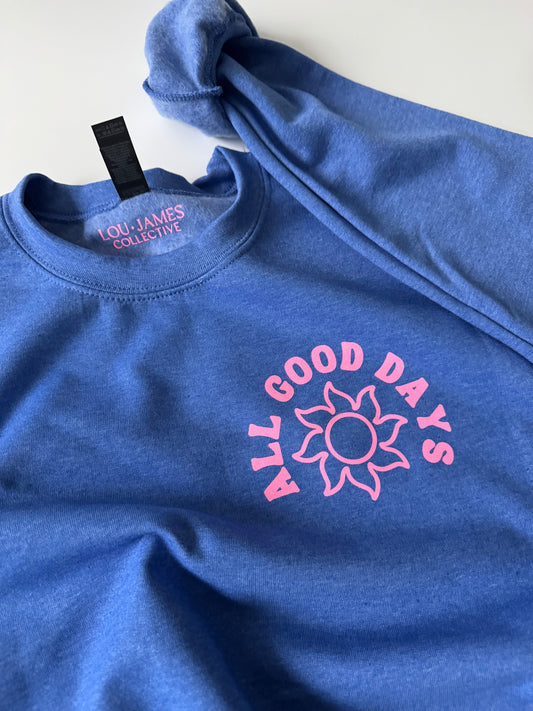 All Good Days Crewneck – “What’s the Best That Could Happen” Blue Graphic Sweatshirt (Unisex Fit)